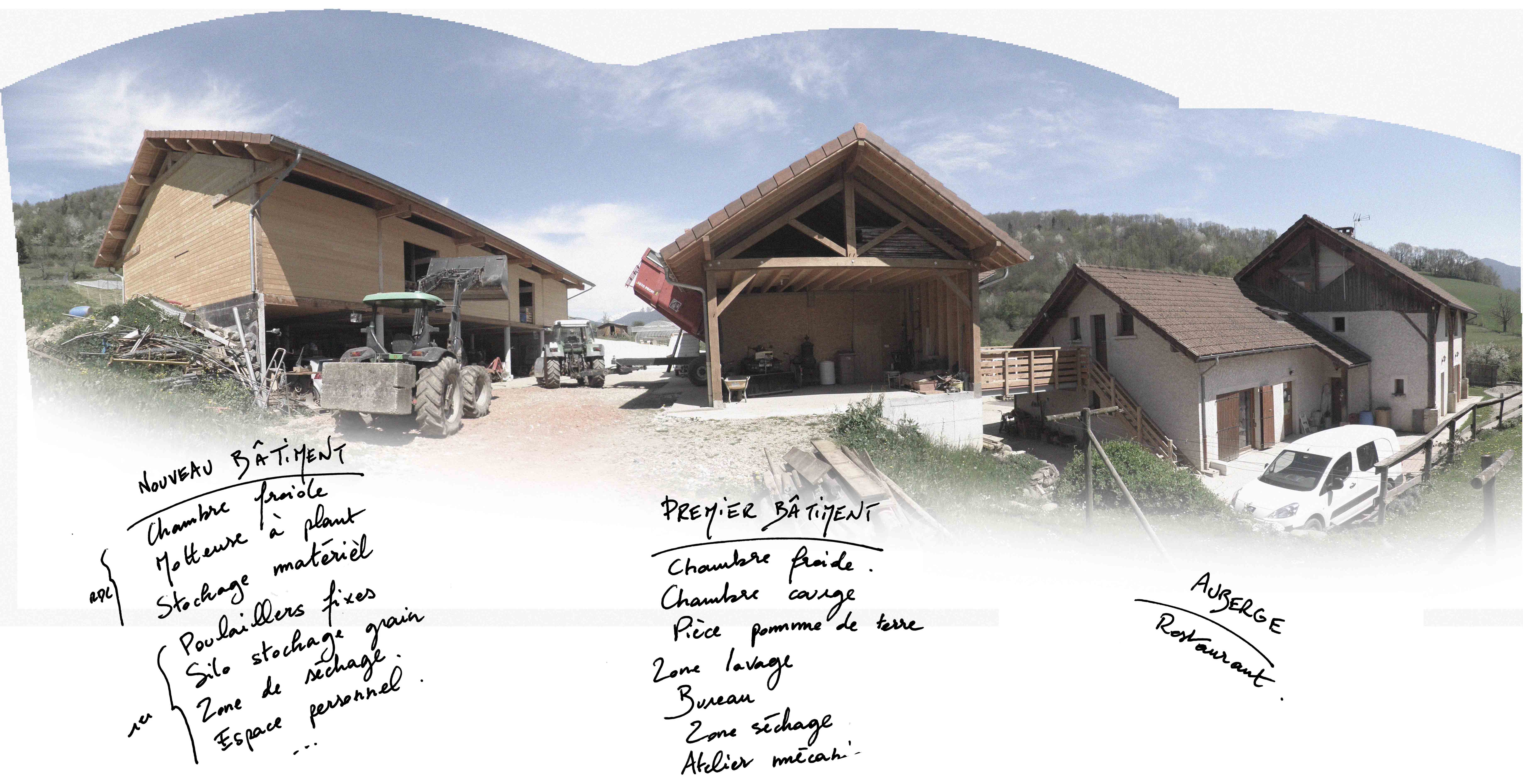o Contexte : la ferme est située dans une pente douce, voire modérée. Depuis la route, la succession des plans se structure ainsi : d’abord, en bas, l’auberge et le parking ; puis un premier bâtiment, puis le deuxième en haut, dernièrement construit.